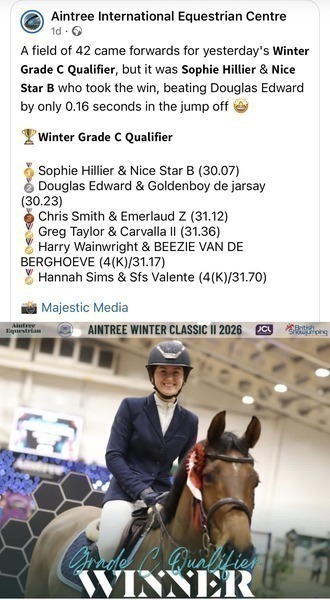 Great to see regular bsh client Sophie hillier and her lovely young mare “nice star b”(highway ) in winning ways at the aintree winter premier show winning the grade c qualifier ..
